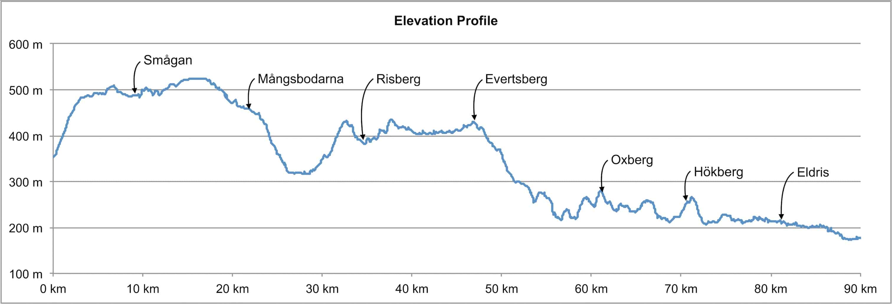 This section is fairly gentle on you. Some humble hills, some dirt road, some gravel road. One section runs along a beautiful lake, and you also have the pleasure of passing the marathon distance sign posting. We were doing a 5:42 min/k pace and feeling comfortable, except for the fact that Sophia had started to feel a slight ITB-pain on the outside of her left knee (that sharp, almost stabbing sensation where the ITB rolls over the outer aspect of your knee joint). Once we came into the Evertsberg aid station, she did a quick stretch, which solved the problem for her (temporarily, we should add). We had given our crew the same time window, 2-3 hrs, from when we left Mångsbodarna to when we could be expected in Evertsberg, and we came in after 2 hrs 16 min. Seeing how well we were doing with regards to our expected times was obviously great motivation. We did the same quick procedure here, where we both got a new set of 2 x 350 ml bottles with 100 kcal Tailwind in each and a new fruit-and-rice puree pouch for both of us. We still didn’t stay for more than 1 min at most, and again – didn’t claim anything from the aid station food-wise. We got the same energy boost from seeing our people this time, and from just feeling the atmosphere. There were lots of people out spectating, cow bells cheering us on as we took off. Oxberg, next up! Michael went through as 130th male, Sophia 17th female.