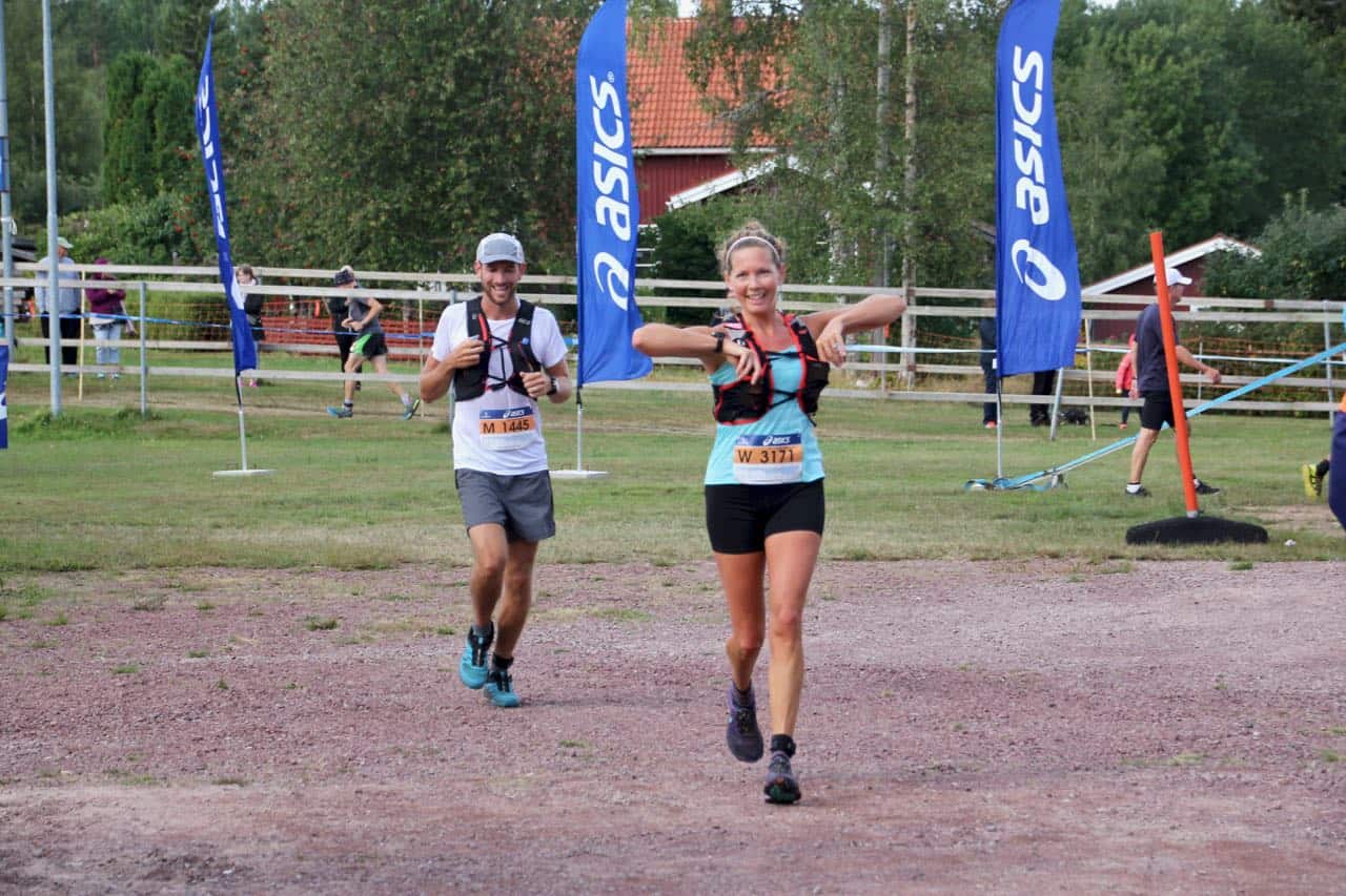 Oh, this was painful, everyone! Easy easy running though – just flat on soft ground. We did get a boost from seeing our crew in Hökberg, and while we knew our pace had dropped significantly, we still had the men’s medal time of 9 hrs and 30 min well within reach. Heck, on any given day 19k in almost 2.5 hrs would have felt like we had all the time in the world! It’s funny thinking back on that now, how long 19k felt. We managed to keep a good pace the first few kilometers towards Eldris, riding on a wave of potato chips, watermelon and sheer buzz. But that unfortunately didn’t carry us all the way in, because it got tough and painful again, and every sign marking a new kilometer elapsed felt like such a victory (but boy, those were spread far apart at this point!). We started conversations upon conversations in hopes it would make time and distance go by but nothing really managed to catch on. We couldn’t really focus on anything but the ‘one foot in front of the other’ mantra. Or, as Michael put it: “All I want to do is just go in to the woods, crawl up into a ball and cry”. That sums it up quite nicely, don’t you think? Reaching Eldris felt amazing for obvious reasons, just knowing that it was the last aid station before the finish. Sophia had cramp twitches in her right groin/adductor region again so she tried a gherkin (Swedish: saltgurka) for the first time in her life – well, never again! That was some intense stuff. Michael went through as 137th male and Sophia as 20th female.